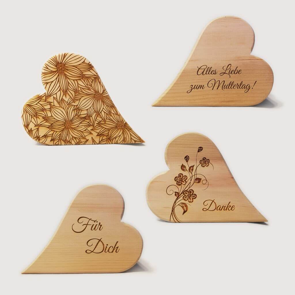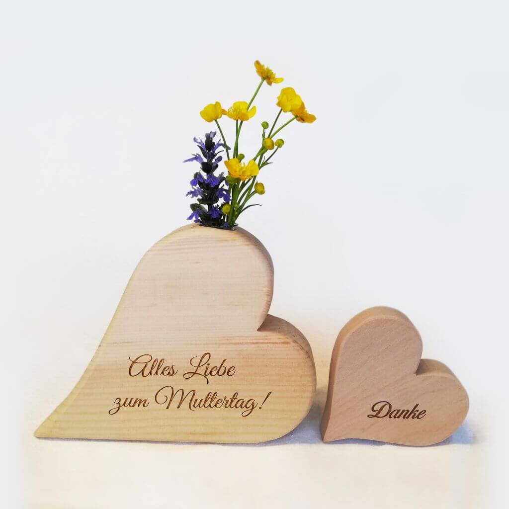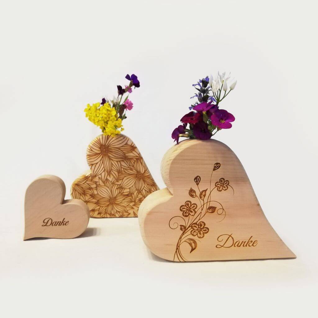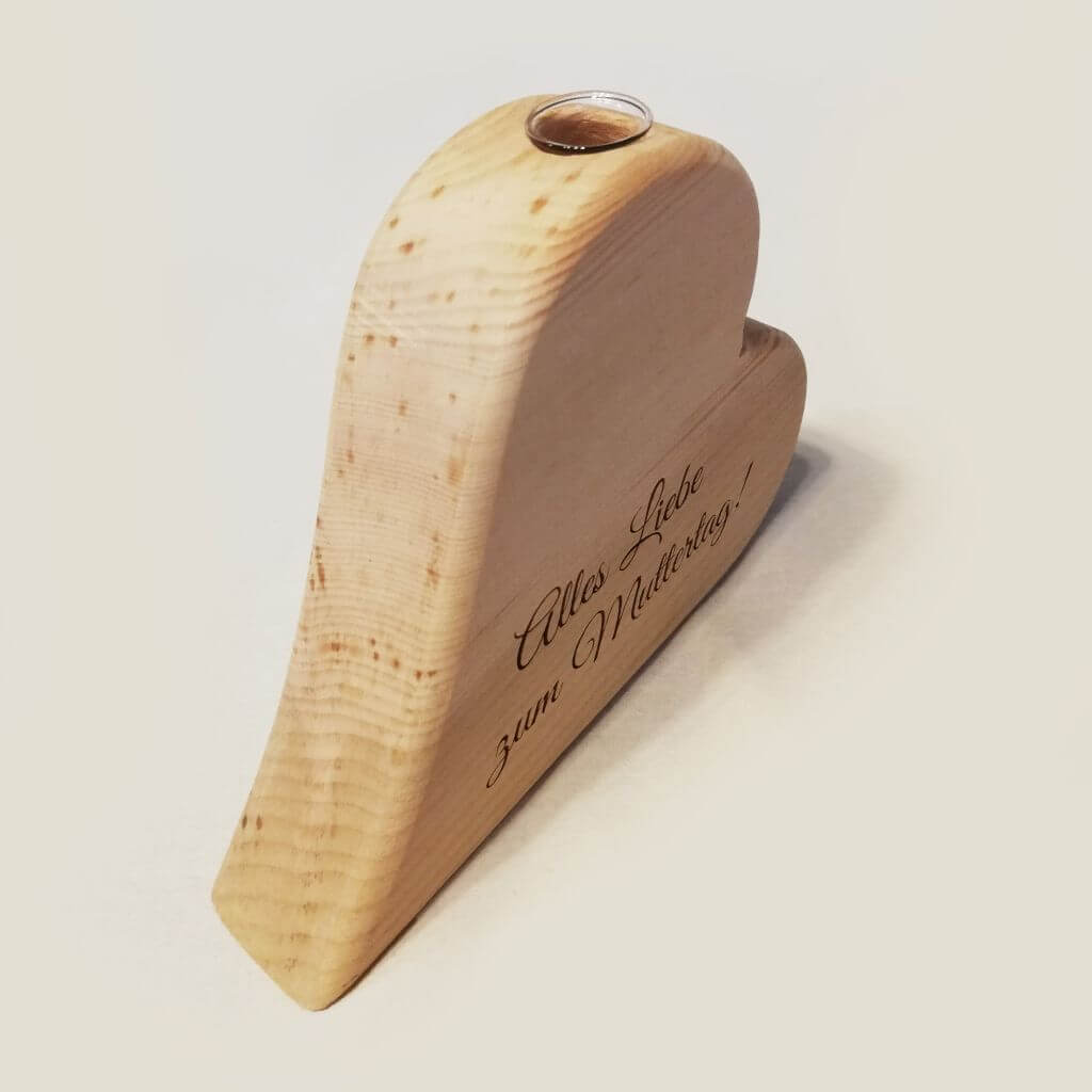 Vollholz-Herz-Vase aus Birnen- oder Zirbenholz mit individueller Gravur inkl. Reagenzglas. Abmessungen ca. 15cm Breite, 12cm Höhe, 3.5cm Tiefe